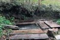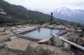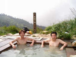 駐車場には結構観光客が来ておりなんと大型観光バスが止まっていました。よく登ってきたな〜(*_*) さて、それではパノラマ露天風呂に入るか〜、蓮華温泉ロッジにて500円を払い今度は自分の足で登る事になりました。ここには泉質の異なる四つの温泉があり、道の途中にも小さな風呂がいくつかあります。さてここで形勢逆転、推定体重○○○Kgのアーパースさんは最初の小さな風呂にて登りを断念、スリムな我々3人がさらに上を目指し登って行くと前方に白い湯気が見えて来ました。なにやら人だかりも見えます。そこは仙気ノ湯と言う一番大きな露天風呂で、山の斜面に木枠の浴槽を埋め込みお湯を貯めただけ、屋根も無ければ脱衣所なんて皆無です。周りからは蒸気があちこちから沸いていおり立ち入り禁止のロープが張られていました。その場で服を脱ぎ恐る恐る入ってみると、チョットぬるかったですがなかなかいいお湯です。パイプで引いている源泉は結構熱く、もう一本引かれた冷たい山水で程よく調節されています。まさに天然温泉ですよ!ただ小さな虫が非常に多く、脱いだTシャツにビッシリ止まって気持ち悪かったです。