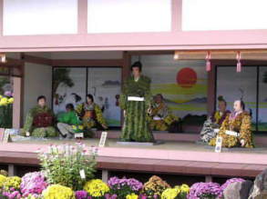 〜PM4:00 本日T.Kさんは山形の仲間と小名浜へツーリングしており、帰りに我々と合流する事になっているのですが、待ち合わせの時間まではまだ1時間以上ありましたので二本松の菊人形を観賞する事にしました。二本松の菊人形祭りは霞ヶ城公園を会場に、毎年10月1日から11月25日の期間に開催され、菊人形の数が約130体、菊株数は3万株を誇ります。藩政時代より菊の愛好家が多く、昭和初期には菊人形が街に飾られ、1955年から菊人形の祭典が開催されました。日本最大級の規模で毎年30万人程が訪れ、見る人を魅了しています。入場料は大人\1,200でした。今年のテーマはNHK大河ドラマの『武蔵』です。菊人形とは顔は人形ですが胴体は色とりどりの大小さまざまな菊の花で飾られています。流石に日本一の菊人形祭りだけあり沢山の観光客で賑わっていました。 |