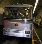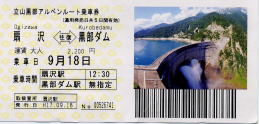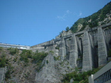 ★おじさんのいう通り奥の左端に単車が20〜30台並んでおり我々もなんとか駐車できました。現在PM12:30予定よりは遅れていますが、今回はここがメインなのでもちろんダムまで行きます。ダムまではトロリーバスでしか行けません、切符売り場の綺麗なおねーさんに聞くと、丁度今改札が始まっていてすぐに乗れるとの事だったので、すかさず往復切符を購入。大人一人\2,200なり。ちなみにこの切符は5日間有効なので、5日間の間に立山連峰に登山に行って帰ってくることも可能な訳です。 ☆バスは5台ほど並んでいましたが、どれも皆すでに座席は埋まっており、立ち乗車しか出来ないようです。ちょっとお疲れ気味の将軍様は一回飛ばしたほうが座れると言ってましたが、帰り(信濃路ツー)の事を考えると少しでも早いほうがいいので忍者使いが強引に乗せちゃいました。(^^ゞ ☆ダムまでは、片道15分ほど掛かりますが、その間に車内放送でトロリーバスの説明が聞けます。それによるとこのバスは完全電気化されており、排ガスで空気を汚す事が全く無い無公害バスであり、パンタグラフから電力を取り入れたバスとしては、国内では関電トロリーバス(扇沢⇔黒部ダム)と立山トンネルトロリーバス(大観峰⇔室堂)の2箇所のみで、最近では環境に優しい乗物として注目されているそうです。 ★という事で黒部ダムに到着しました。