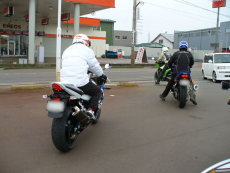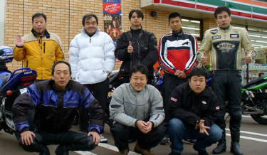 走り始めて直ぐに『寒〜い』と感じた忍者使い「もっとゆっくり行こうよ〜」と思ったのはおいらだけか?先頭のオルカさんは寒さをものともせず加速して行きます。すかさず親分が例の格好でオルカさんの背後にピタリと付ける。「みんな朝からなんでそんなに速く走れるの?」「おいらはスロースターターなんだよね!」(-_-;) そんな事を思いながらも着いて行くと程なく与板町へ到着する。いつもおいらはここで病気が出るのですが流石はオルカさん、迷う事無く街並みを通り抜けなんなくR8へ出る。と思いきや信号を右折、えっ?そっちですか?忍者使いの驚きをよそに構わず進むオルカさん、しかし道は越路町でバイパスの下を通り抜けちゃんとR8に出られました。GPSで確認していたアーパースさんによると、ちゃんとR8と並行して走っていたそうです。 残念ながらここで見送りの乾巧茶親分が帰る事になり、そのまま長岡方面へ左折して行きました。親分遠くまで見送りありがとう。(^^ゞ 我々は右折し曾地峠途中のローソンで休憩を取る。バイクを停めるや否やすかさずトイレに駆け込む忍者使い、気温はまださほど上がらずHOTの缶コーヒーで冷えた体を暖める。ピロユキ君のメンバー写真もここで撮影、ピロユキ君なかなかのひょうきん者のようですね!(^^ゞ