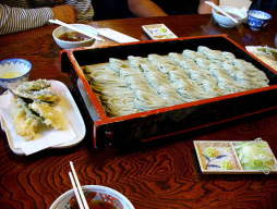 小千谷市内には数軒の蕎麦屋さんがありますが、今日はへぎそばの元祖と言われている“角屋”さんを選択しました。しかし流石に新蕎麦の時期です。すでにお客さんが大勢並んでいました。予約ボードに記入して待つ事20分程で席に付き、6人で一升盛(4人前)を2つと天ぷら3人前を注文、再び待つ事30分程でようやく出来てきました。 小千谷蕎麦は良質のそば粉をふんだんに使い、つなぎに布海苔(ふのり)を使って打ち上 げます。 打ち方にも独特の工夫をこらしてあり、その腰の強さと歯ざわりの良さ は”食通のそば”として広く知られています。 ”へぎ”は当地方独特の呼び名であり、その意味は剥板を表しています。 即ち檜材を薄く剥いで折敷(おしき)を作り、その角盆の中に一口そばを三十個程並べたものがへぎそばです。