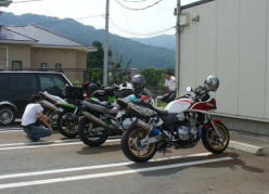 ☆やはりアーパースさんとおいらの好みは合わないかも?それにしてもよく食べるね・・・(^_^;) 冷やしらーめんと店内の冷房により汗ばんだ体もさわやかになり、いざ新潟目指し出発です。帰りのルートは再びアーパースさんの先導で、上山バイパスより南陽市宮内地区を抜けてR113に出るルートですが、R13から宮内へ抜ける峠道はメチャクチャ荒れていました。舗装路というより石が敷き詰められた山道といったほうが正解ですね、おいらオフ車みたいに腰を浮かせて走り抜けました。 R113に出てからはひたすら道なりに直進するだけなのですが、いつもながらこの道は変化が無く退屈な道です。空いているならそれなりに楽しめるのでしょうが、交通量はけっこう多いし、まだ1時間くらいしか走っていないのにおいら尻が痛くなってきました。アーパースさんは「小国の道の駅」で休憩を考えていたらしいのですが、堪らず手前の小国セブンで休憩を要請する忍者使いなのでした。(^_^;)