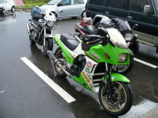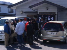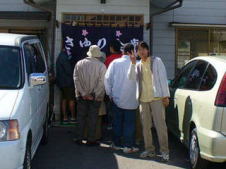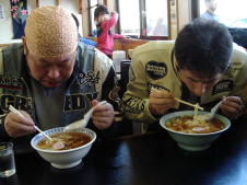 ★忍者使いを先頭にR290より七谷→村松経由で馬下R49へ、道は完全ウェット状態で空からはあたりまえのように雨が降る。体はさほど寒くは無いが徐々に革グローブに雨水が染みて来る。出発からすでに1時間以上が経過するもここはまだ新潟県阿賀町(旧津川町)であった。いつもよりもかなり遅いペースだが雨の中をバイクで走るのはやはり辛く、唯でさえ雨天走行が苦手なおいらにはこの先が思いやられる。ここから福島県西会津町まで約20Km間はコンビニがない為ここで休憩を取ることに、しかしみんな口数も少なくおとなしい、たいした会話もないまま一服していると雨が少し小降りになって来たので早々に出発する事にした。(なんか暗いね〜)西会津町からR49を離れK16へ、ここから最短ルートで喜多方を目差す。しかしここで早くも試練が・・・所々道いっぱいに杉の枝やら葉っぱやらがびっしりと敷き詰められ、雨水と杉の脂で路面はヌルヌル状態になっていた。おまけに横殴りの突風が容赦なく襲い掛かる。重いGPZの車体が一瞬横に移動するように感じハンドルもふらつきメチャメチャ怖い。いつもなら30分程で喜多方まで行けるのになんか倍くらい掛かったような気が・・・(ーー;) 暇なので行列の写真を撮ろうとカメラを構えていると、一人の食べ終わったお客が店から出てきてそのままおいらの方へと近づいて来た。「なんだ人が写真とっているのに邪魔な奴め」と思っていたら、なんとその客はまえすとろ君であった。(@_@)突然の登場に驚く忍者使い、なんでもアーパースさんから“さゆり食堂”で食べると聞いていたらしく、車で高速飛ばして来て一足お先に食べていたとの事。「とても美味しいラーメンでしたよ!それでは皆さんお気を付けて〜」と、とっとと帰って行っちゃった。くっそ〜車はいいよな〜(ーー;) 順番はまだまだ来ません、この待ち時間の間にオルカさんがZX-10のチェーンのたるみを修正に掛かりました。しかし作業の順番に悩むオルカさん、なんと忍者使いのアドバイスが功を奏し無事に作業は終了。たまには役に立つでしょ?おいらも!(^^ゞ それにしてもなんか滅茶苦茶緩んでましたね〜!結局1時間近く待ってようやく中に入れました。待ちくたびれた忍者使い、オルカ、ロメオの3人はラーメン大盛を注文、しかし何故かアーパースさんは普通盛でいいとの事、え〜?どうしたの?具合でも悪いの?何の事はない、しっかりカレーライスも注文しておりました!(^^ゞ ↑ちっちゃい丼が似合わないアーパースさん(^_^;) さて肝心のお味の方は?豚骨ベースに煮干のダシが良く効いていおり、少し濃いめの醤油が食欲をそそるしっかりとした味付けです。チャーシュウも味が良く染み込んでおり、やはり濃い目でこれで炒飯作ったら美味いんじゃないかな〜!忍者使いは大盛にも拘わらず一気に食べきりましたが、スープだけだと結構しょっぱく、ほとんど飲めませんでした。食べ終えた後の水がやたらと美味しく感じられました。あくまで個人的な見解ですが、味が濃いめのラーメンは確かに美味しいと思うのですが、スープが最後まで残さず飲める位の味加減が理想かな!だけど美味しいラーメンだったのは間違いないです。(^^ゞ |
