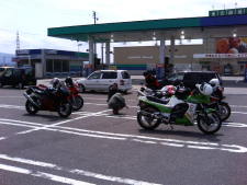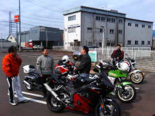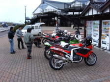 この後はアーパースさん、ユタカさん、乾巧茶さんの3名がお見送りに来てくれました。参加微妙だったT.K君は結局現れず今年も仕事が忙しいみたいです。今日はここまでかな?思ったところにブエラーさんがGSX-R1100で到着、なんでも集合場所間違って月岡に行ってしまったとの事、なんかいつかのおいらみたい。^_^; すると自分と同じマシンの登場にライバル心が刺激されたのか見送りのつもりだったユタカさんが「やっぱりおれも参加しようかな〜」と一言。そこで最初の休憩地点[出雲崎天領の里]で待ち合わせる事にしました。 |